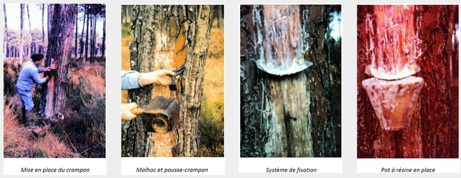 Le premier geste de la campagne consistait à cramponner, c'est-à-dire à mettre en place sur le tronc du pin une lame de zinc ou crampon et une pointe, système de maintien du pot destiné à