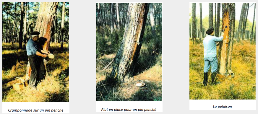 pelesoun : opération consistant à écorcer le pin sur une soixantaine de centimètres de haut et une vingtaine de large et à découvrir légèrement le cambium ou tan pour permettre
