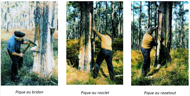 pique : opération consistant à pratiquer une entaille dans le tronc du pin pour provoquer l'écoulement de la résine ; on répétait ce geste toutes les semaines ; c'est-à-dire 4 ou